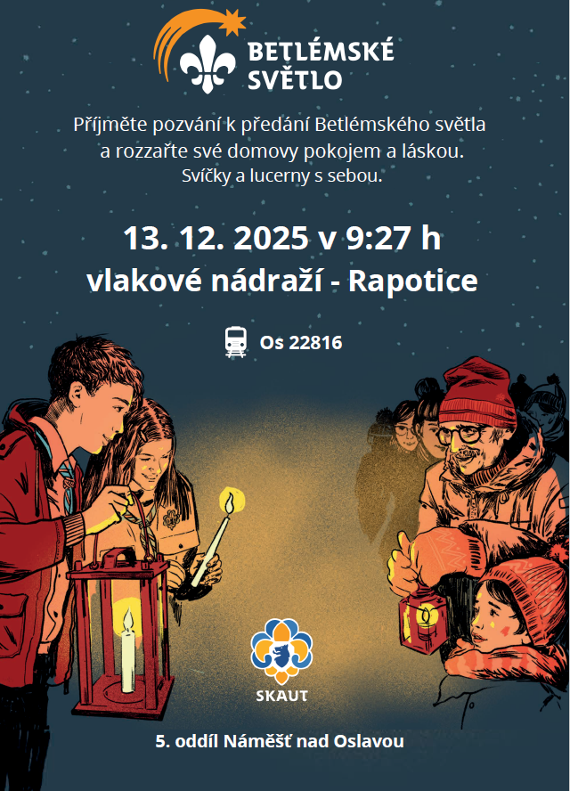každý rok rozváží skauti po celém světě Betlémské světlo. Již třetím rokem se i my - skauti z 5. oddílu Náměšť nad Oslavou k rozvozu přidáváme. Jedná se o trasu osobního vlaku (Os 4806 a Os 22816) z Brna do Náměště nad Oslavou se zastavením také ve Vaší obci Rapotice. Rádi bychom Vás touto cestou pozvali v sobotu 13. 12. 2025 k převzetí světla na vlakovém nádraží.