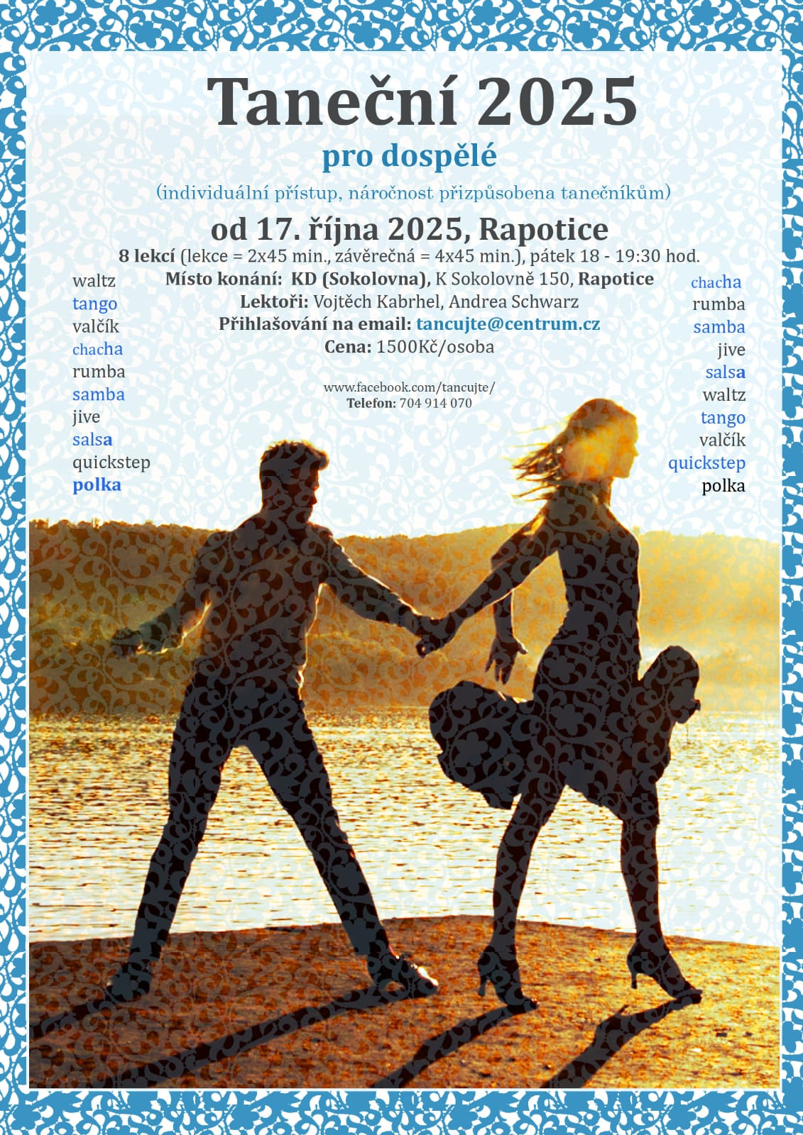 nabízíme možnost "Taneční pro dospělé 2025" v obci Rapotice. V případě zájmu se přihlašte na mail: tancujte@centrum.cz, tel.: 704 914 070.